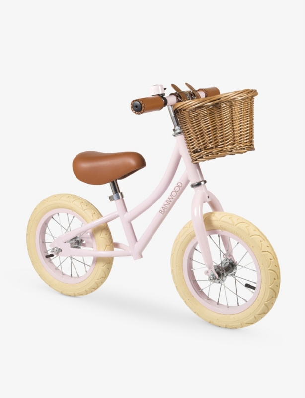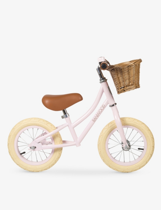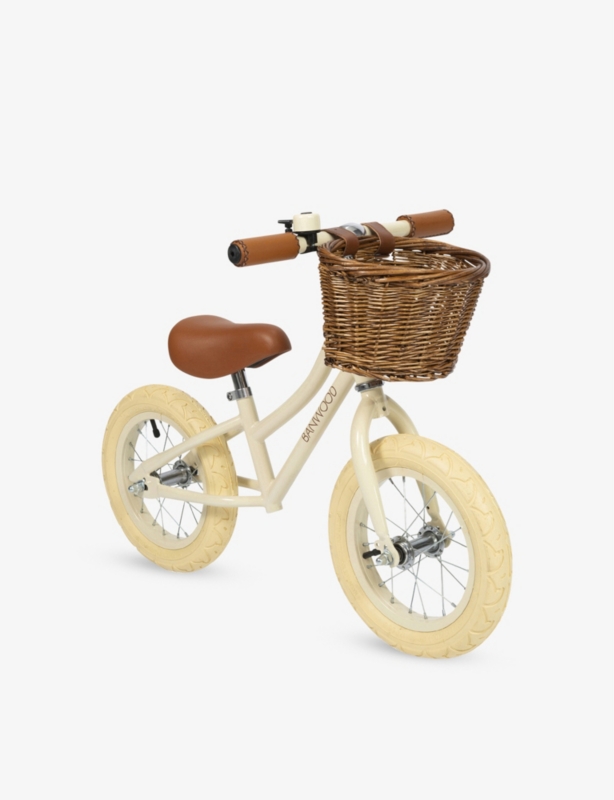 - Tricycle, coloured frame, padded seat, adjustable handlebar height, attached woven basket at front