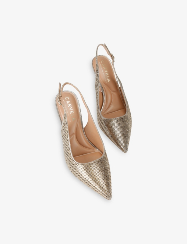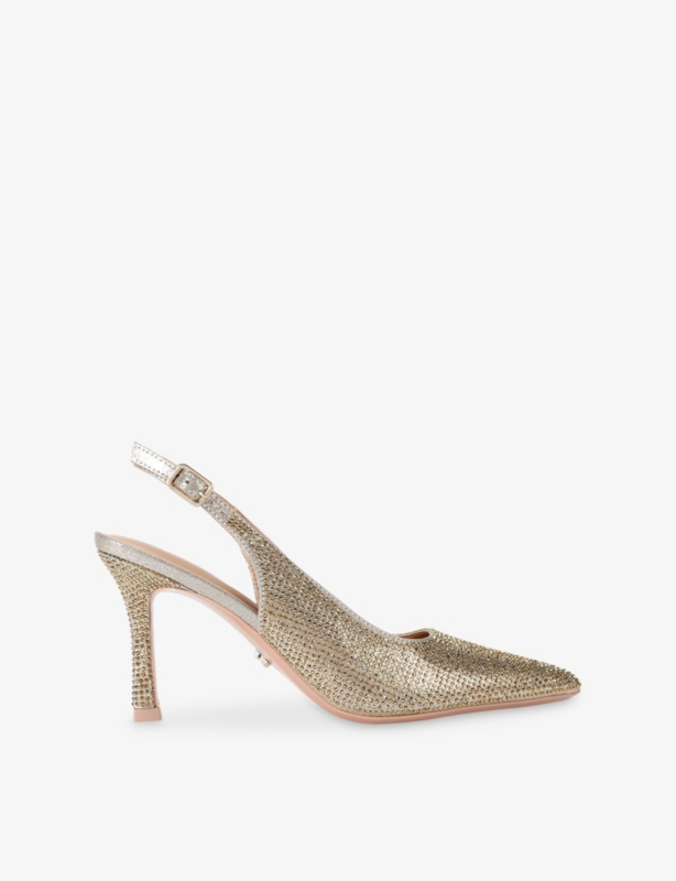 - Pointed closed toe, all-over shiny smooth surface, two-bow detailing at front, sling-back style, open back, kitten heel