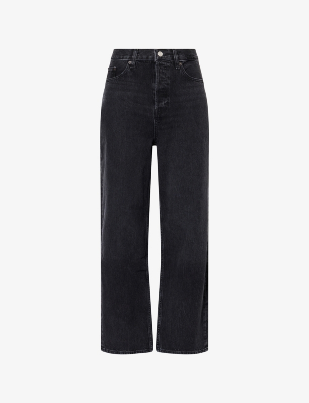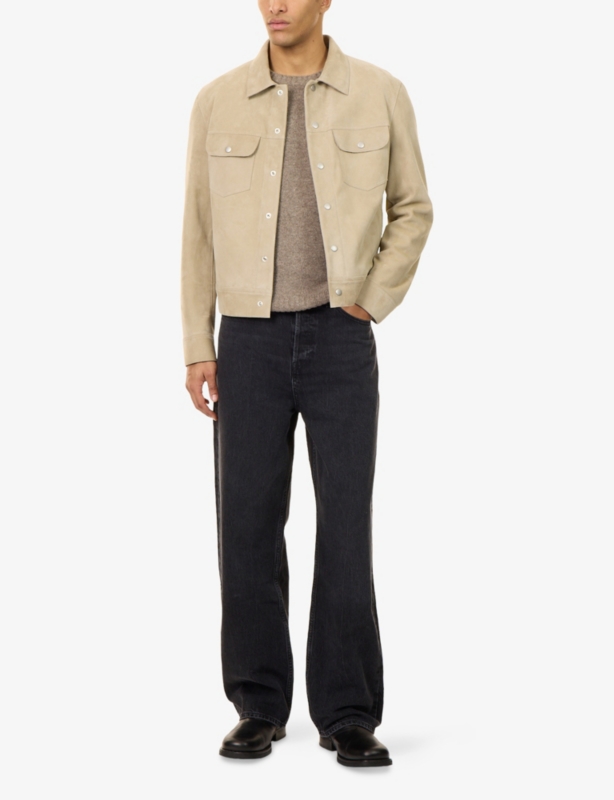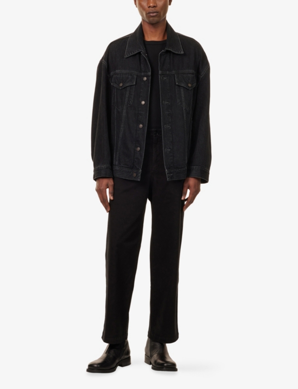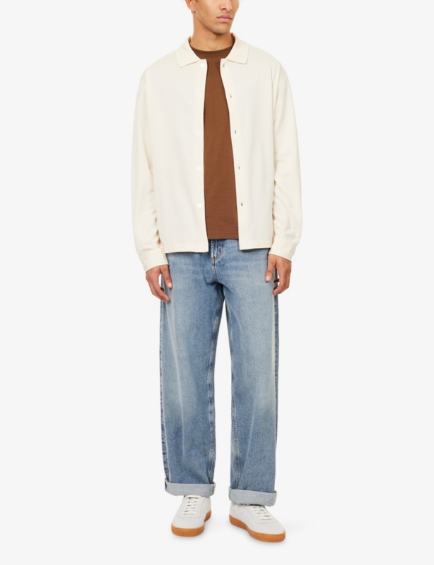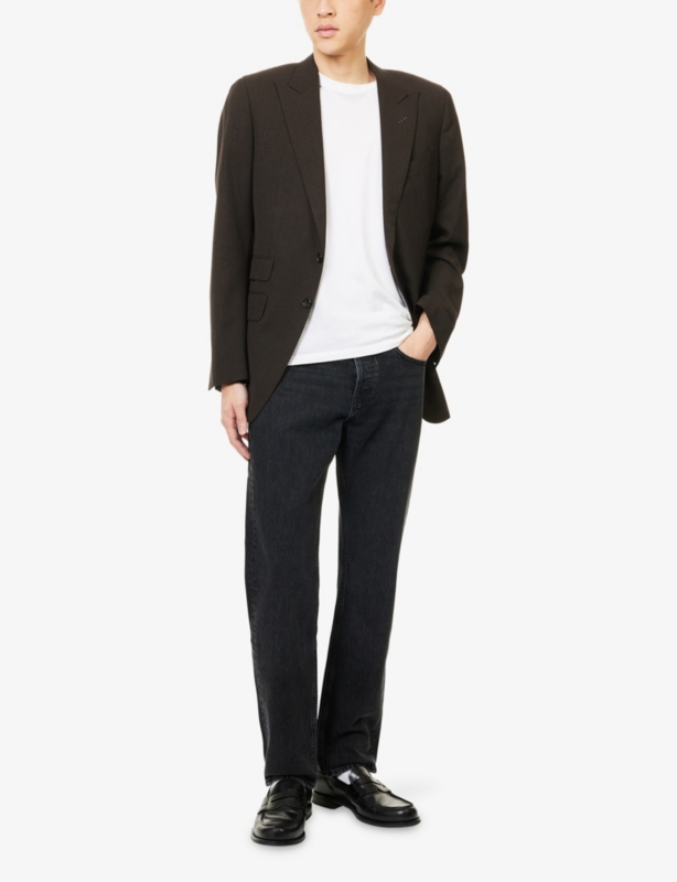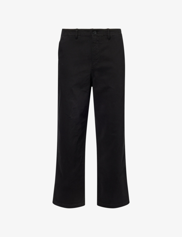 - Exposed button and concealed zip-fly fastenings at front