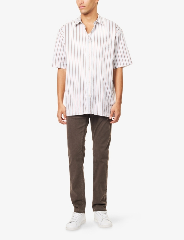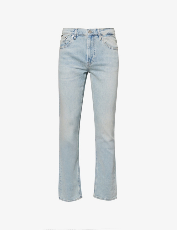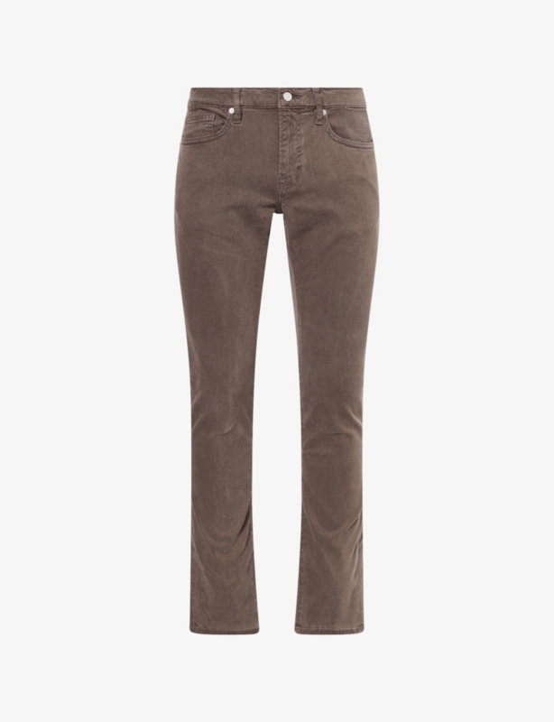- Slim fit, mid-rise, slim leg, belt loops, five pockets, branded hardware, V-shaped yoke at back