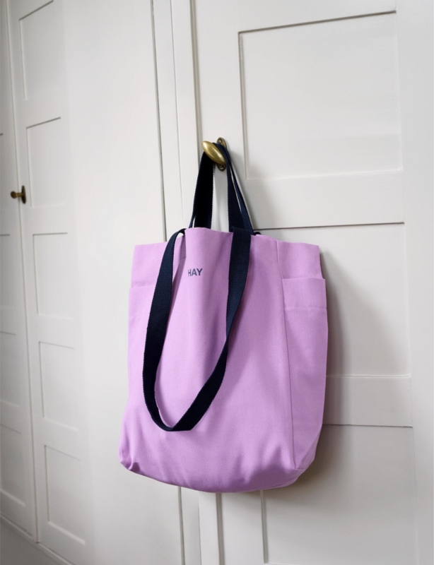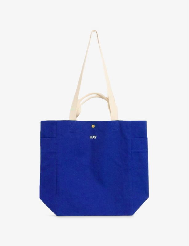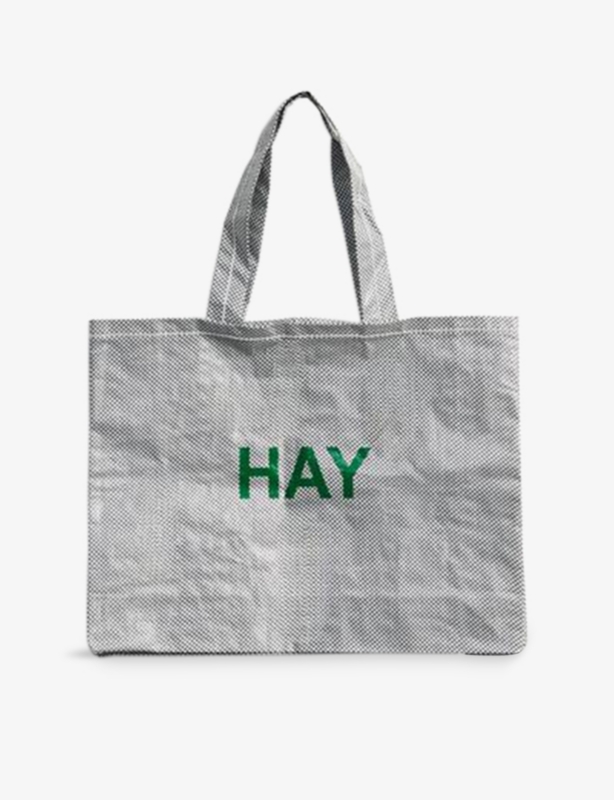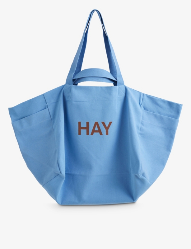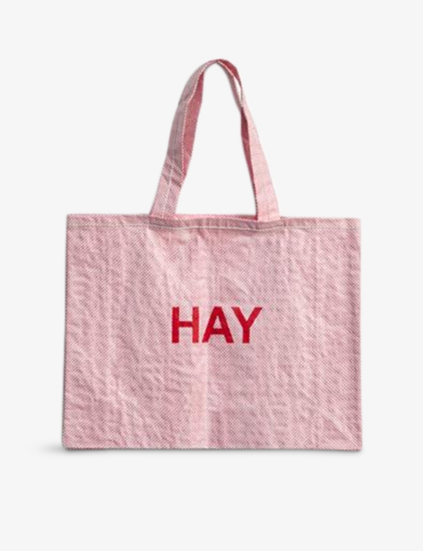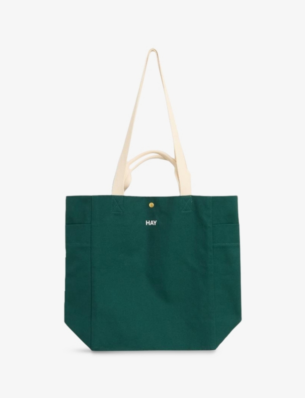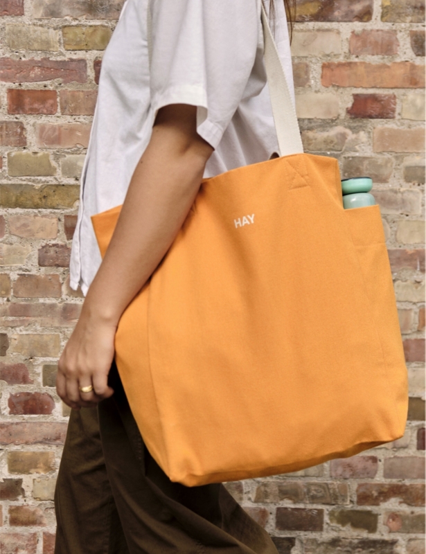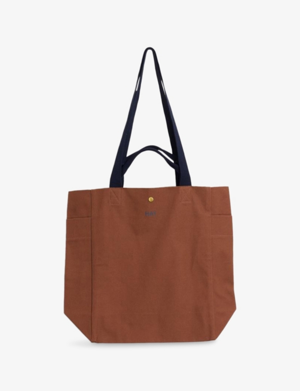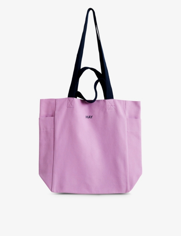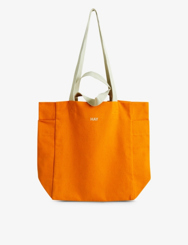 - Tote shape, double flat top handle, two external slip pockets at sides, logo text print at front