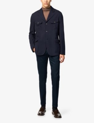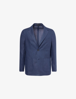 Our men's double-breasted blazers cut a sharp, powerful silhouette - the classic style enhances your shoulders and trims your waist. These jackets combine well with decadent accessories such as pocket squares or opulently patterned ties. Our range includes a variety of single-breasted iterations in fabrics, including ultra-cosy wool and breathable linen. Round out your collection with office-ready options with check, puppy-tooth or pinstripe finishes, and consider durable twill and seersucker textures to smarten up your weekend looks.Â