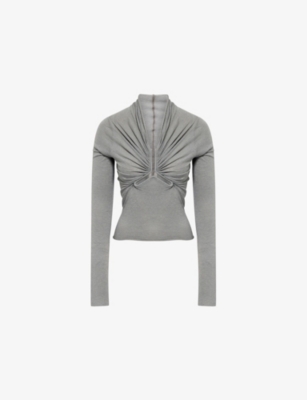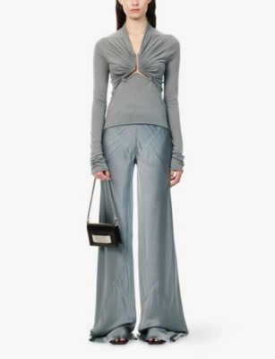 Discover all that the Paris-based label has to offer with our extensive Rick Owens collection. Look out for the signature design touches that have bestowed cult status upon the brand: waterfall draped jackets and cardigans, dropped crotch trousers, stacked sole platforms and raw asymmetric hems - all in the moody colour palette that the designer prefers. Even the most minimal of these garments are crafted in lavish fabrics. Explore knitwear in pure cashmere, smooth leather jackets, party pieces in slinky silk and velvet and versatile basics in the softest woven yarns. Ever adaptable, a Rick Owens item can be styled as part of a head to toe runway look, or to add an unorthodox layer to everyday ensembles.