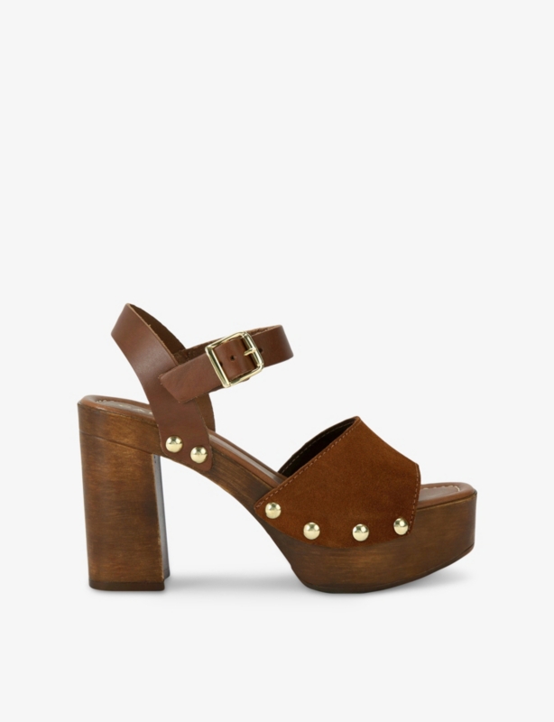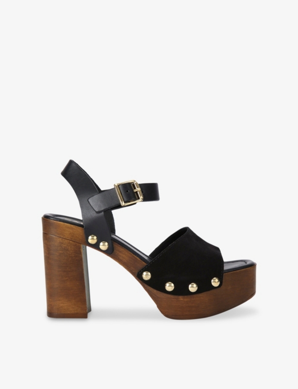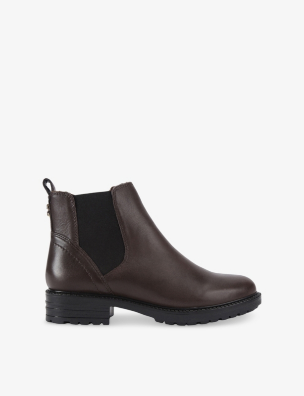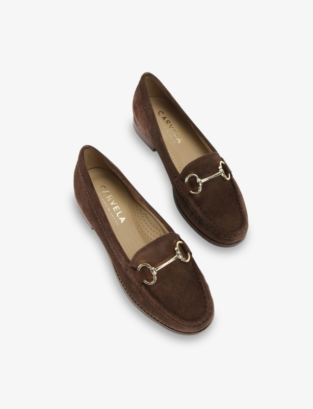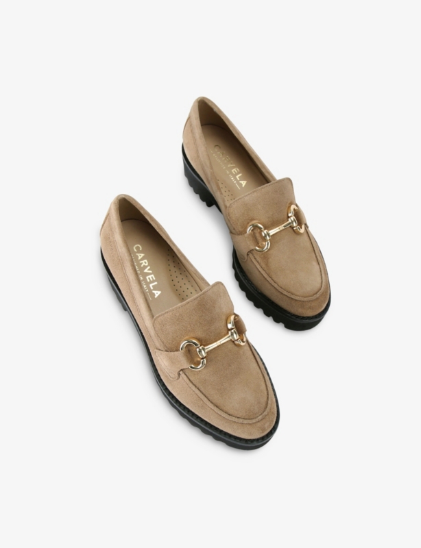 - Closed round toe, horsebit chain at front, embossed logo at side, gold-toned hardware, padded back counters, low block heel