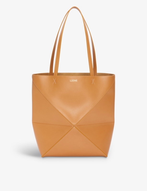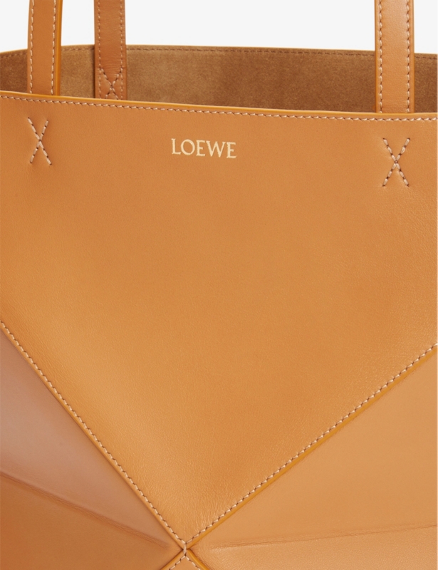 - Logo-embossed leather trims, logo print, gold-tone hardware, tonal stitching