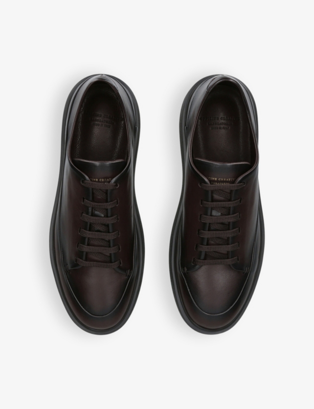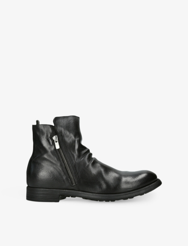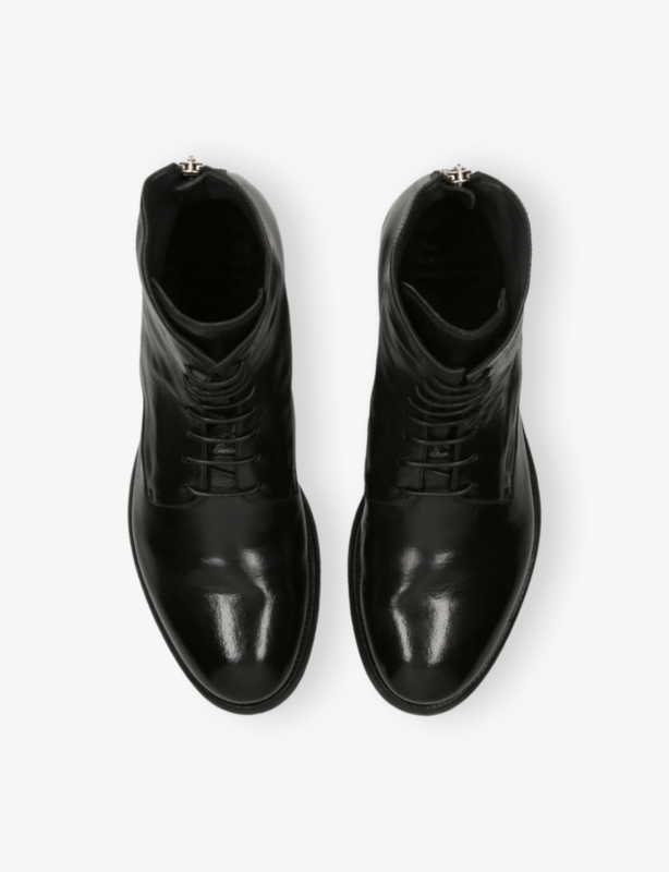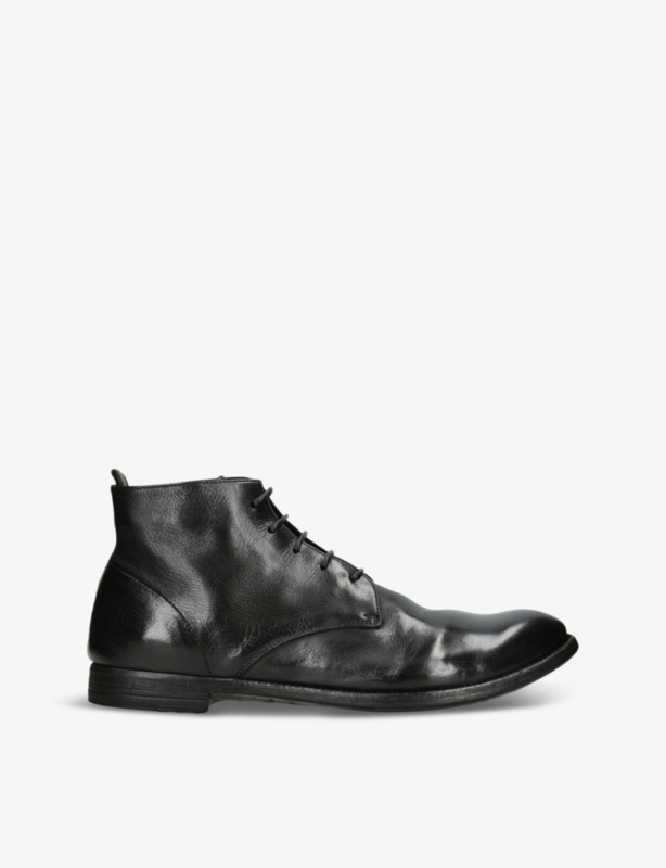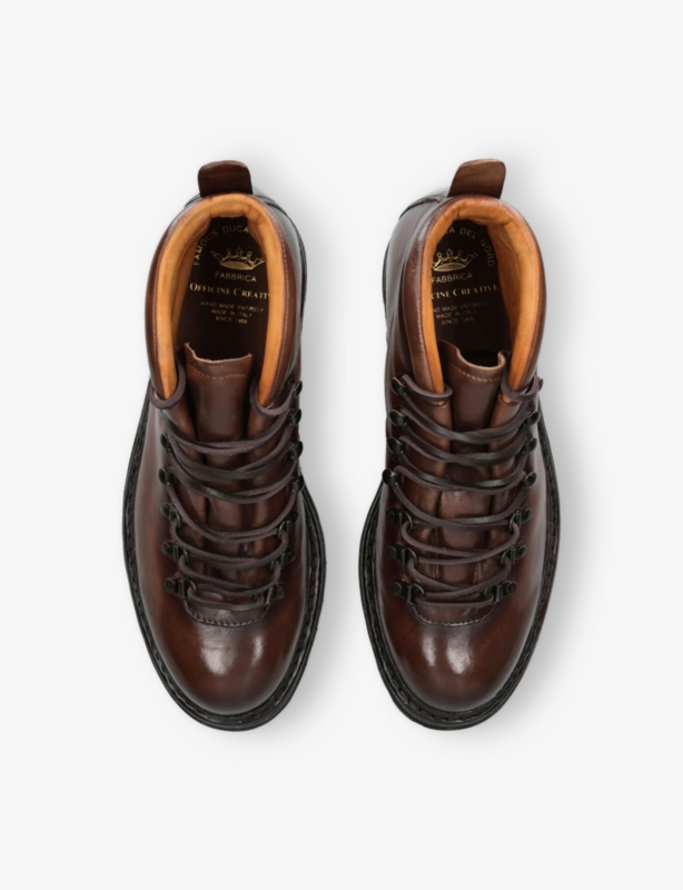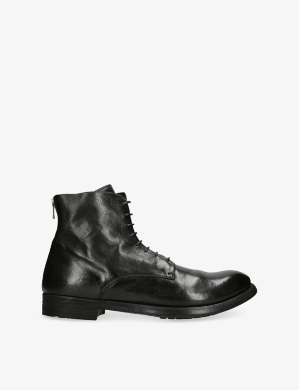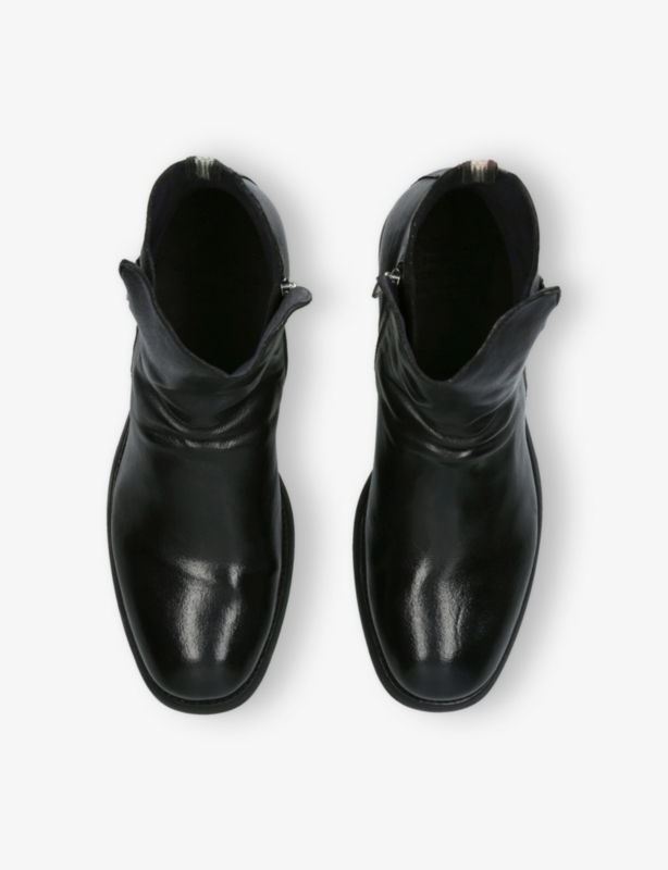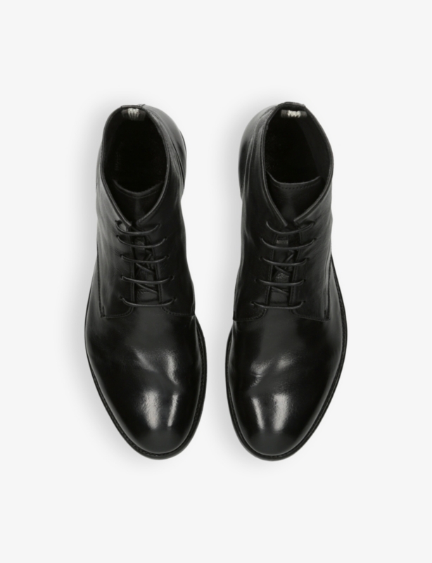 Round toe, airbrushed leather finish, stitched leather sole with custom rubber injection
