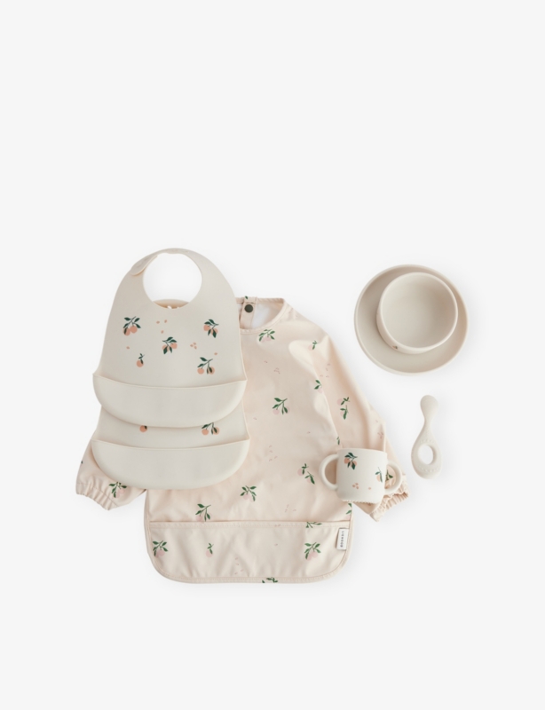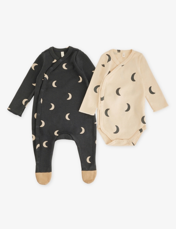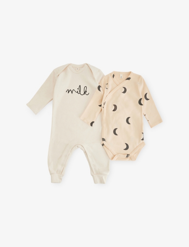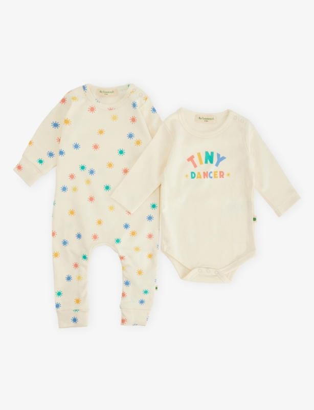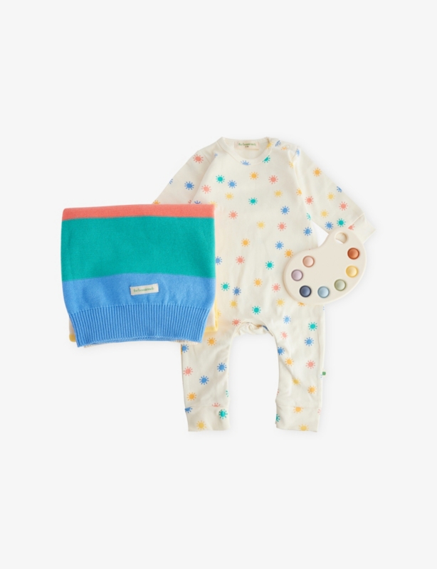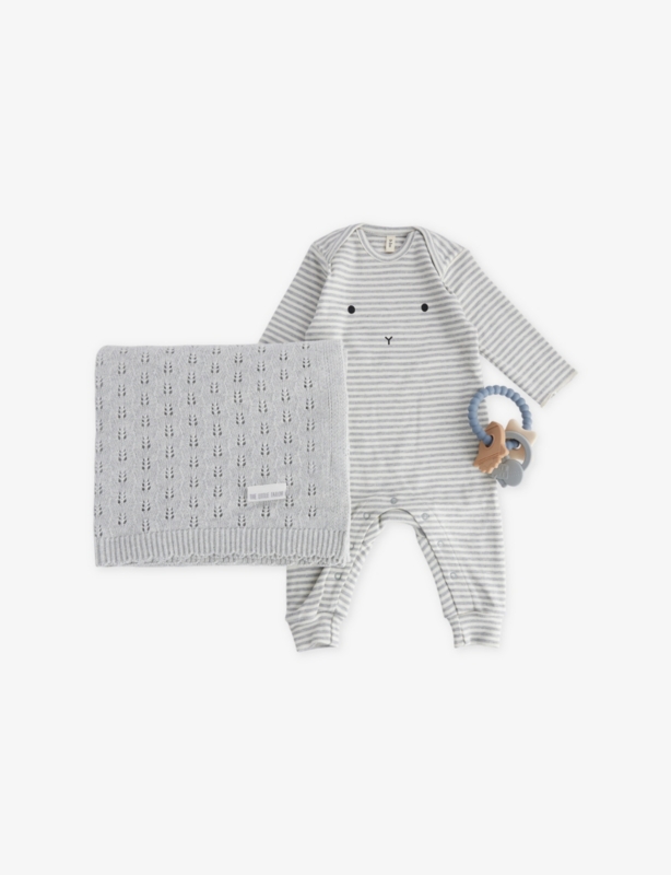 Includes: The Little Tailor cotton-knit blanket, Organic Zoo cotton romper, Konges Sløjd rubber teething toy, gift box