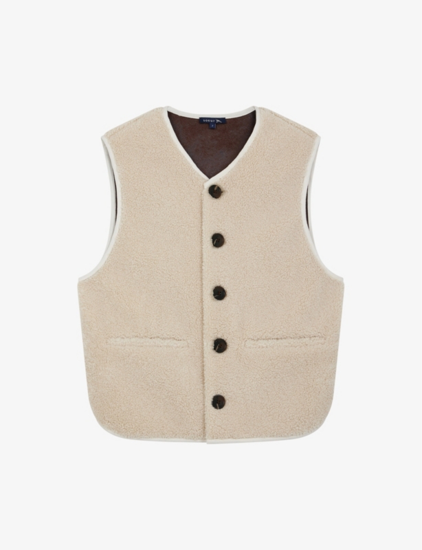 - Straight fit, V-neck, sleeveless, all-over teddy texture, two welt pockets to the front