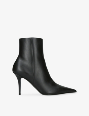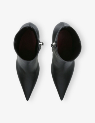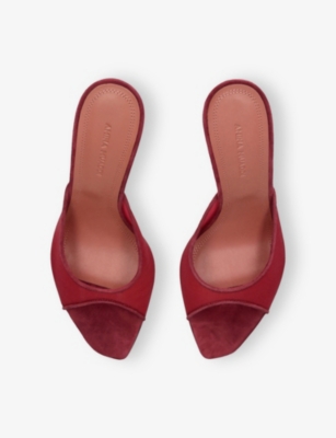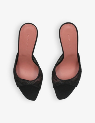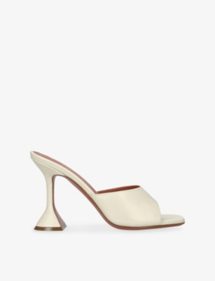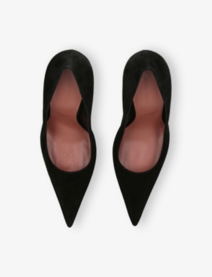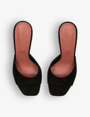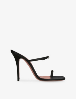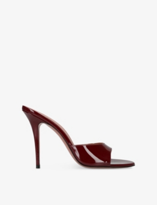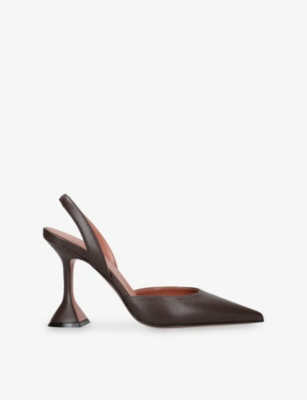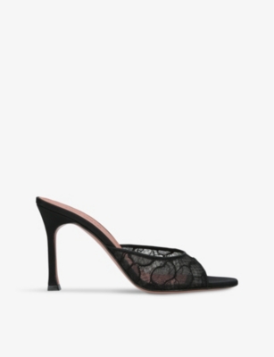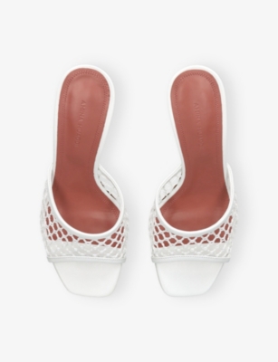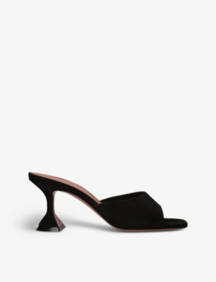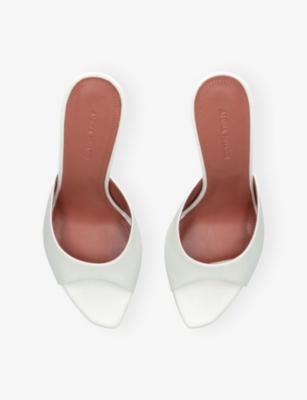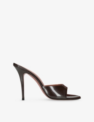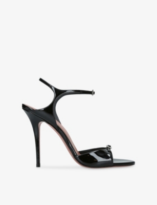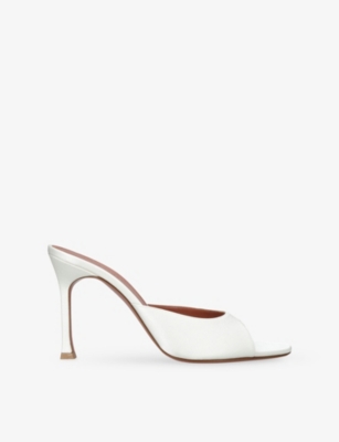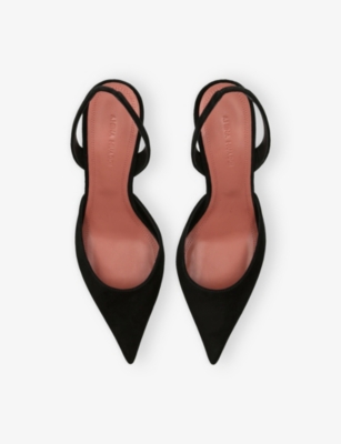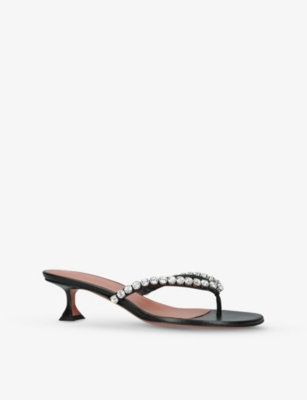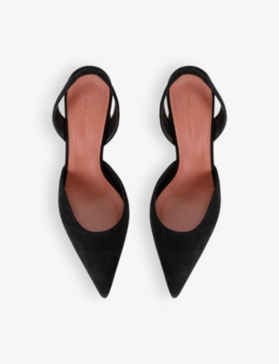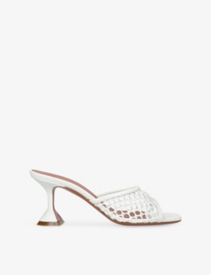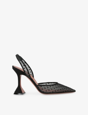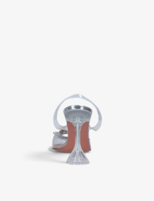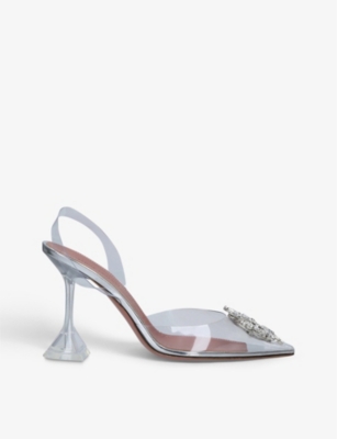 In our collection of Amina Muaddi footwear and accessories, discover an array of materials including soft calfskin leather. Clear PVC is a brand signature, as are crystal embellishments and sparkly straps that make for a futuristic kind of glamour. Each design displays Amina Muaddi's creative perspective - think delightful bow detailing and kitten heels. Meanwhile, pointed toes, spike studs and reflective latex evoke a sense of playing dress-up, all grown up.Â