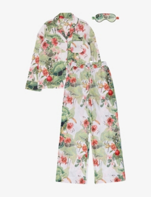 Put a sleek spin on your sleepwear with our assortment of satin sets. Opt for pyjamas in block colours - think buttery olive greens and classic magnolias - or choose from a mix of eclectic prints. You'll find lavish botanical patterns alongside kaleidoscopic chintz, florals and nature-inspired illustrations. Look for the little details in each set - we're talking silk contrast piping, front slip pockets and pearlescent buttons. Loose-fitting styles with straight-cut legs and oversized tops are designed for that extra layer of comfort. Pull on your favourite pair before slipping under the covers, or team with a matching satin dressing robe and slippers for lounge days indoors.