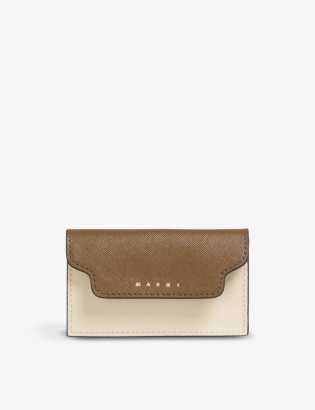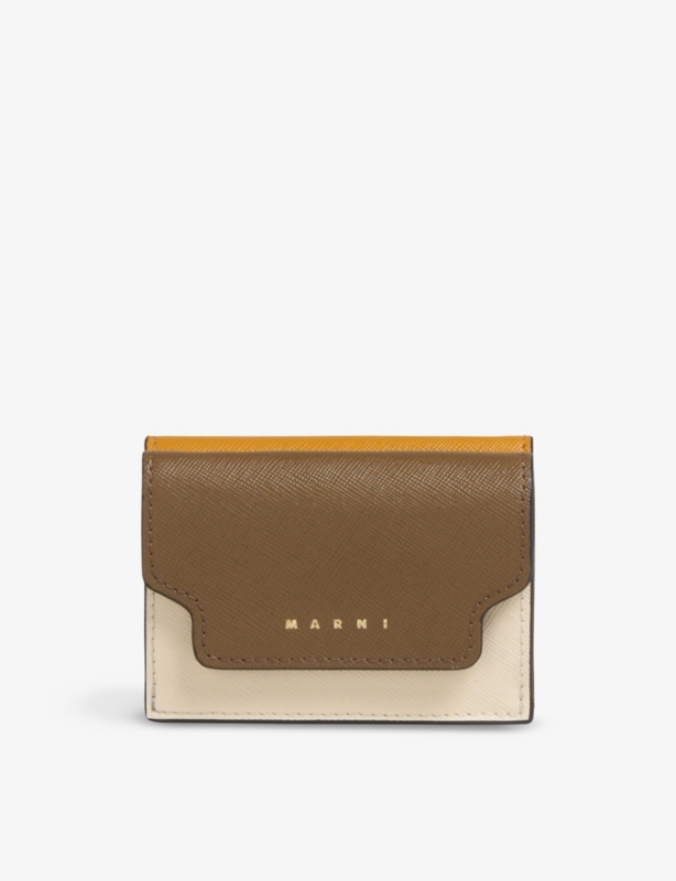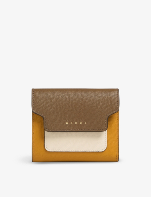 - Rectangle bifold silhouette, colour-block design, gold foiled branding at the front, gold-toned hardware, interior note compartment, four card slots, snap-fastened coin pocket