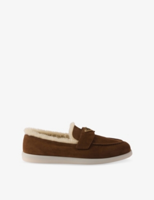 Triangle-plaque suede and shearling loafers