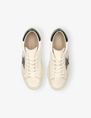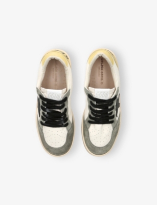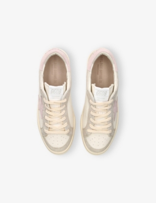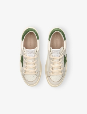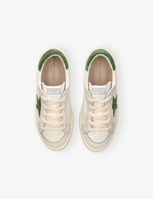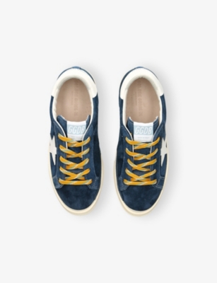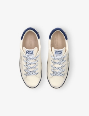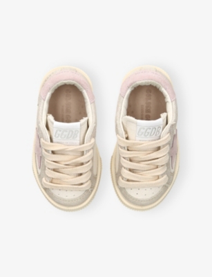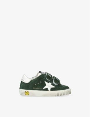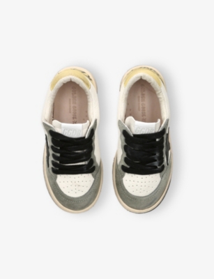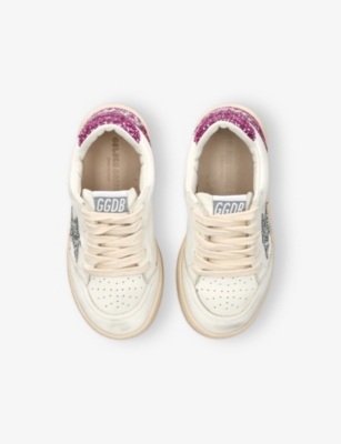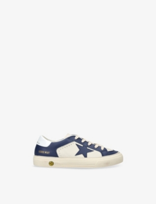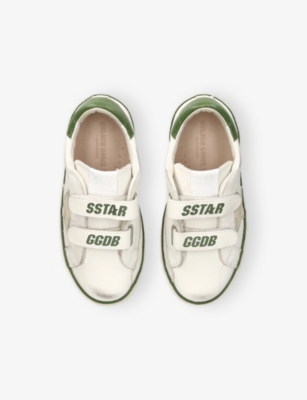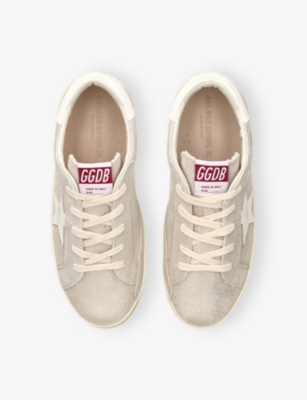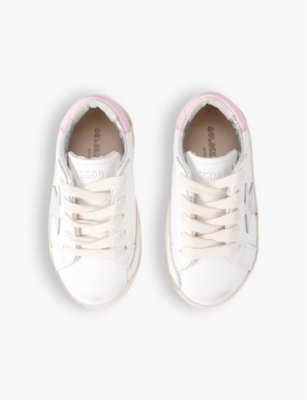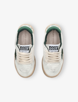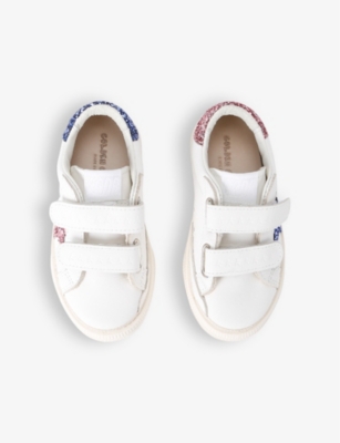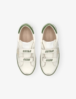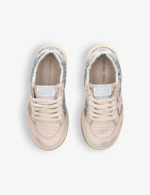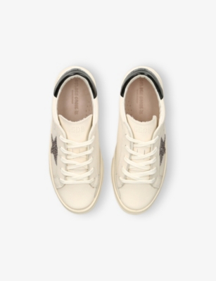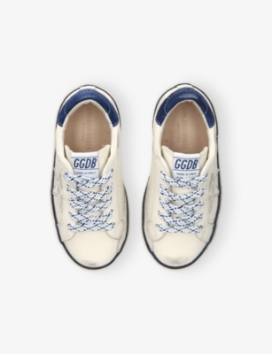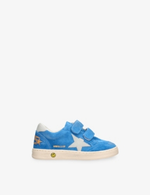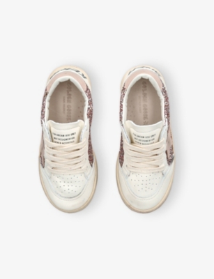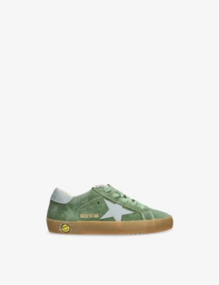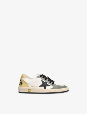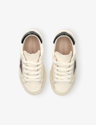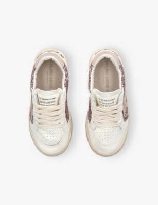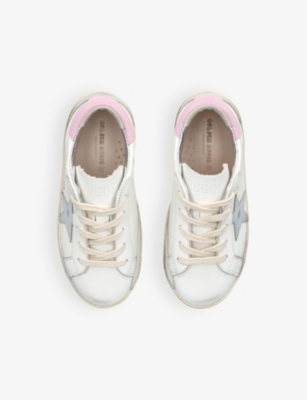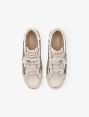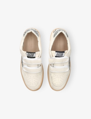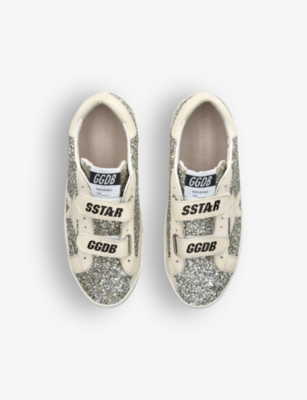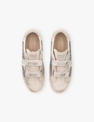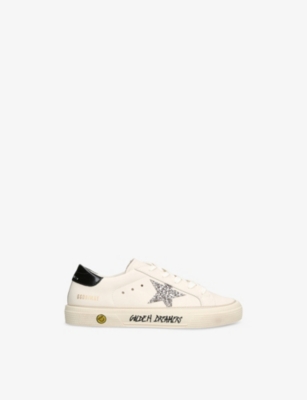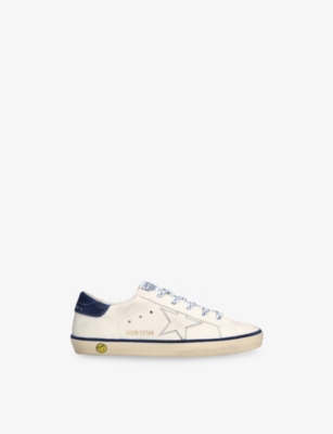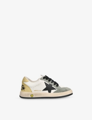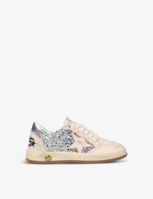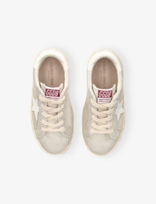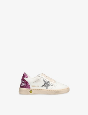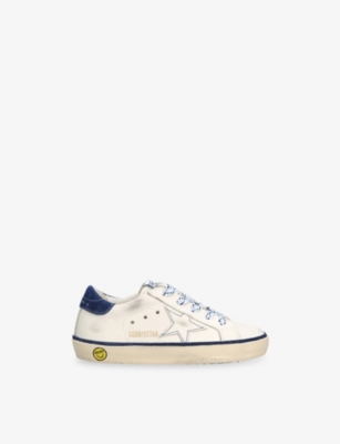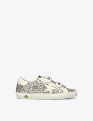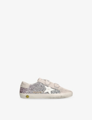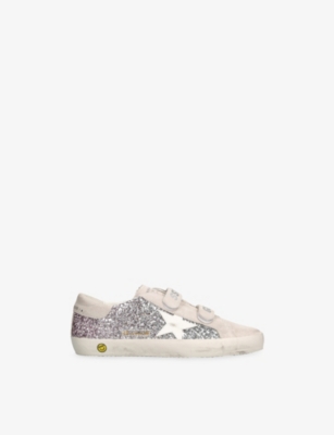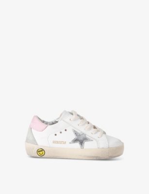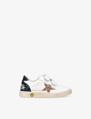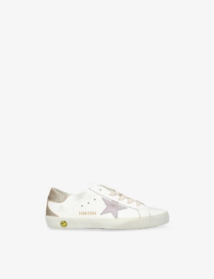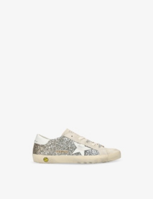 Explore Golden Goose. The Italian label's range of kid’s trainers includes artfully pre-distressed pairs stitched with its signature star motif, plus metallic and glittery renditions. The Italian trainers are designed with a fun, worn-in look, you'll find shoes with sparkly details, metallic finishes, and even glittery styles that make every pair extra special. Golden Goose started in 2000 by two designers from Venice, Alessandro Gallo and Francesca Rinaldo. They wanted to mix modern style with vintage charm, and even though the brand started with inspiration from skate parks in Los Angeles, they always kept their Italian design roots strong. There’s a variety of shoes to choose from, including canvas high-tops that remind you of the '80s skate scene, leather trainers with fun details like suede or leopard prints. Every pair is made with care and features the signature Golden Goose star on the side. Plus, look out for cool embellishments, bright heel tabs, and stylish lettering! Pick from lace-up trainers with a laid-back, skater vibe or slip-ons for a comfortable twist on street style. These shoes combine fashion and comfort, and they’re sure to become your favourite go-to pair for playtime and downtime!