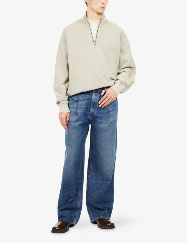 Relaxed fit, high-rise, wide leg, twisted seam detailing, belt loops, five pockets