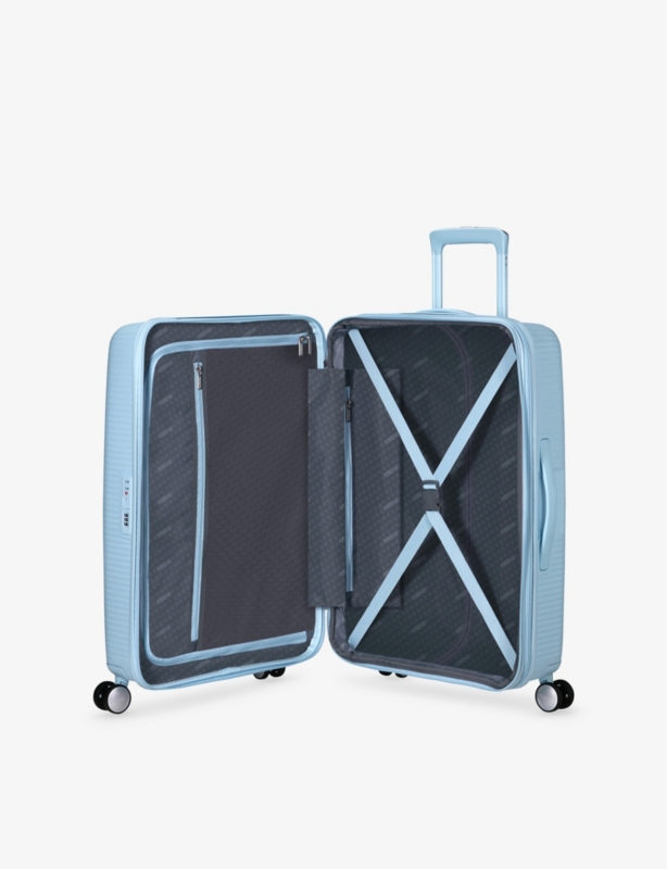 - TSA to allow safe travel to the US, top handle at the front, logo at front, zipped pocket, two wheels