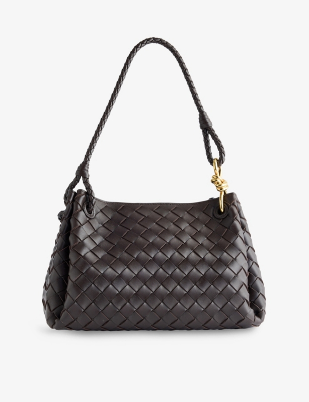 - Knot detail at top handle, one main compartment, double-faced weave, silver-toned hardware