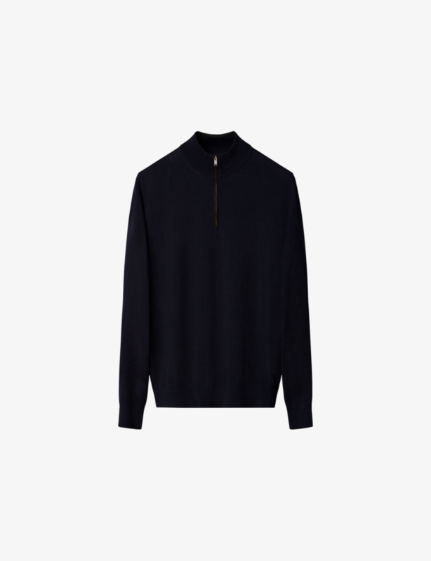 <li>Slim-fit, long sleeves, pleated panel at front, contrasting black buttons, curved hem