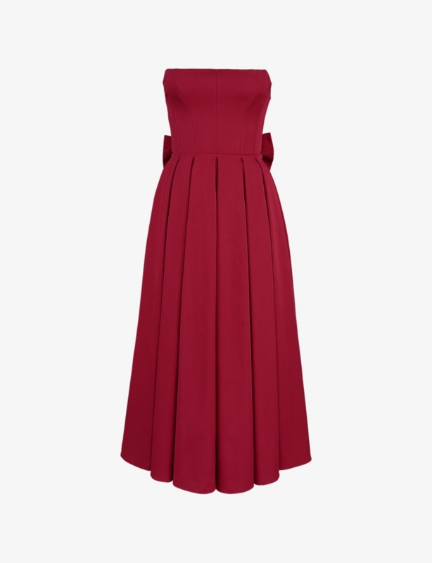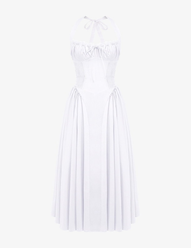 - Slim fit, halterneck, asymmetric neckline, tie collar, open back, two adjustable straps at back, asymmetric hem