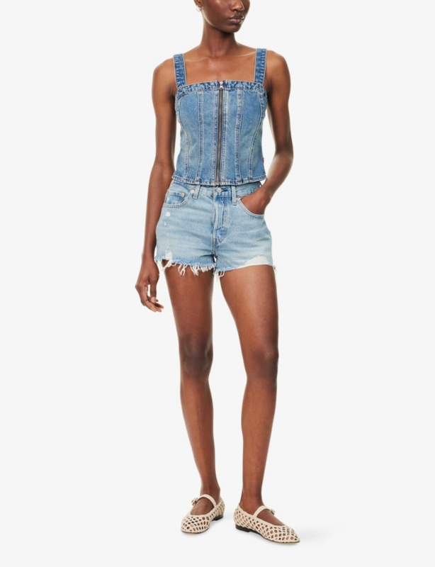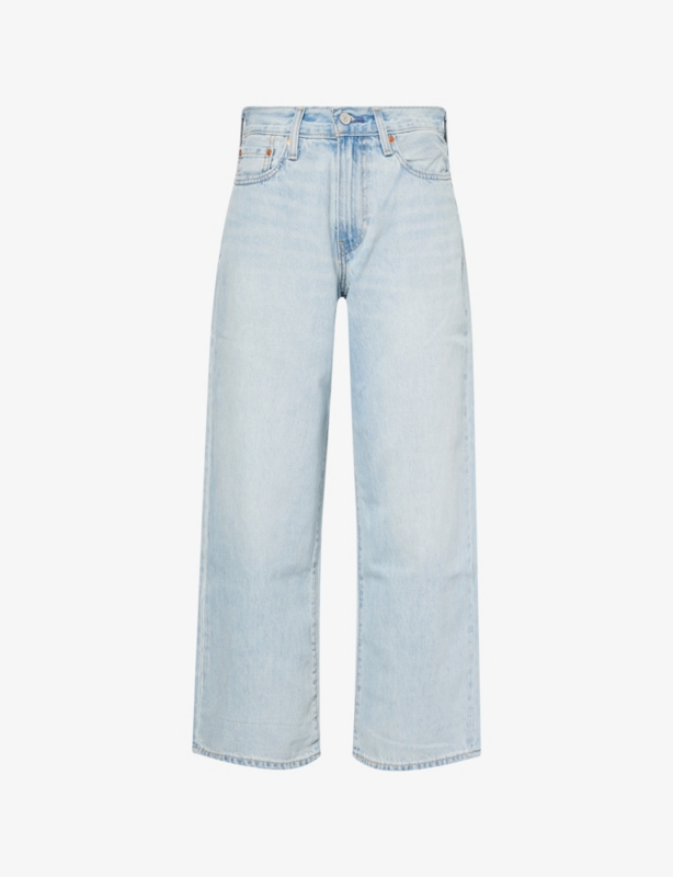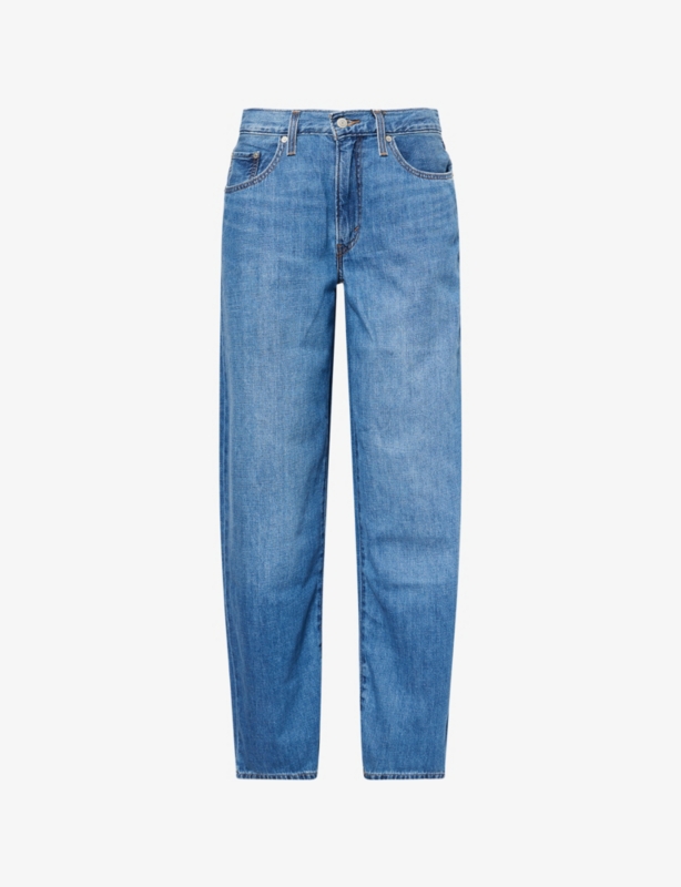 - Slim fit, high rise, structured waistband with belt loops, five pockets, brand patch at back, mid-faded wash, contrast stitching, branded hardware, raw hems