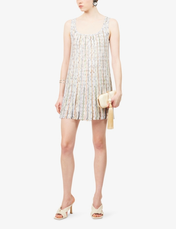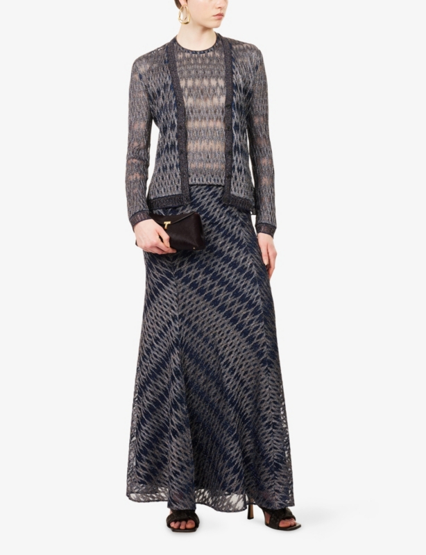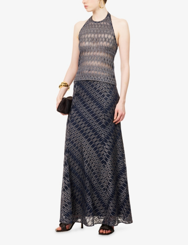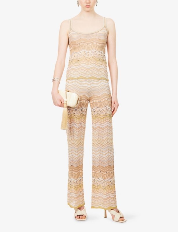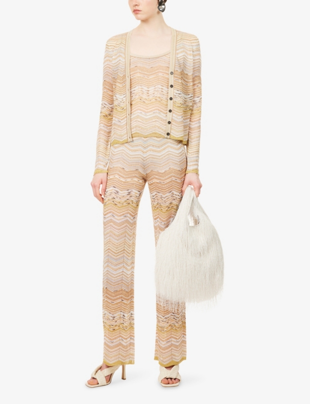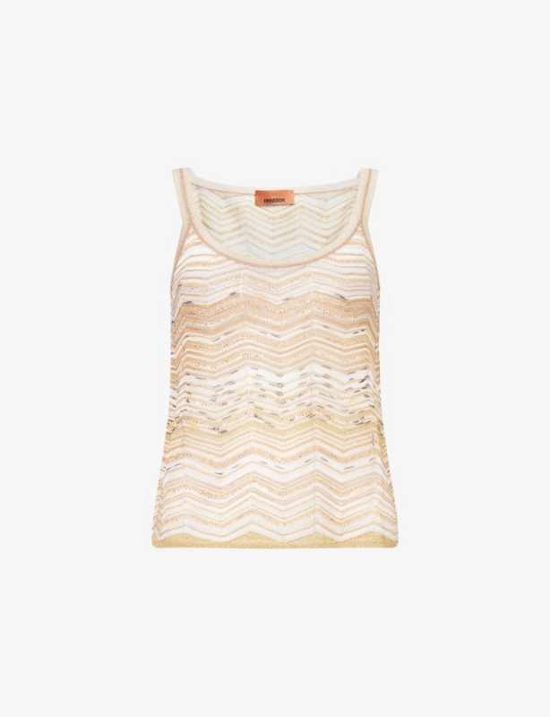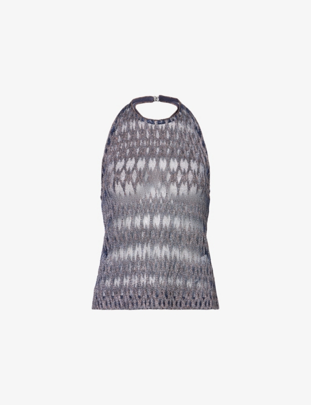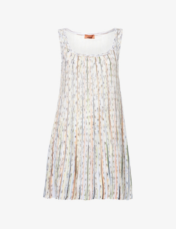 - Regular fit, high-neck, sleeveless, all-over chevron print, all-over knitted, multicolour, flared hem