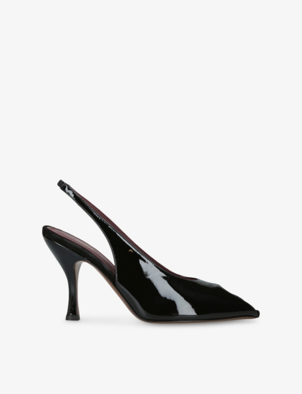 - Pointed closed toe, sling back strap, lace trim, kitten heel