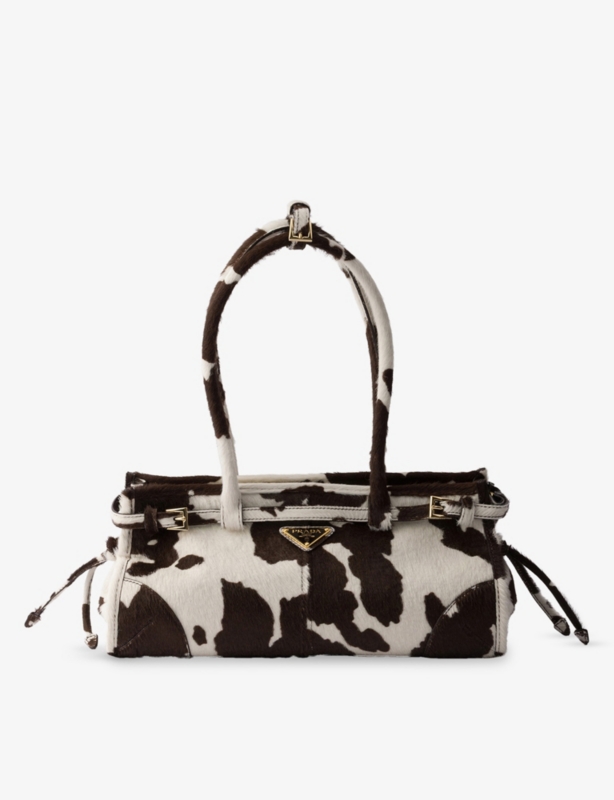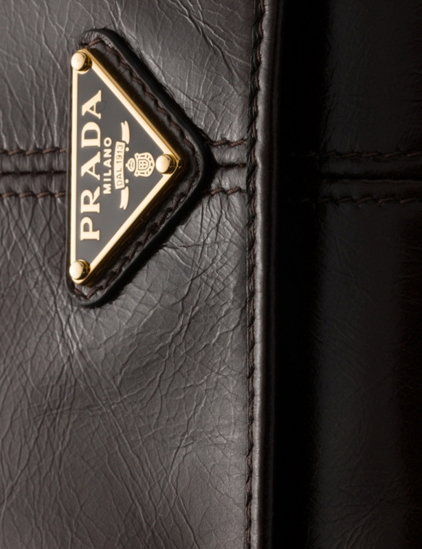 - Two adjustable shoulder straps, top handle, drawstring closure, front flap, two front pockets with flap and buckle closure, two interior pockets one with zip, enamelled triangle logo on front, silver-toned hardware