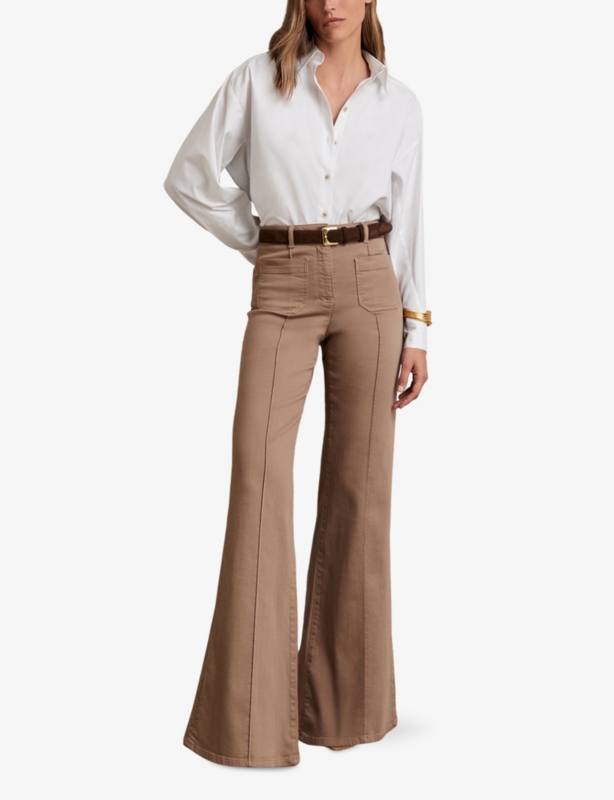 - Regular fit, asymmetric high neck, flounce sleeves, side slit, ruched detail