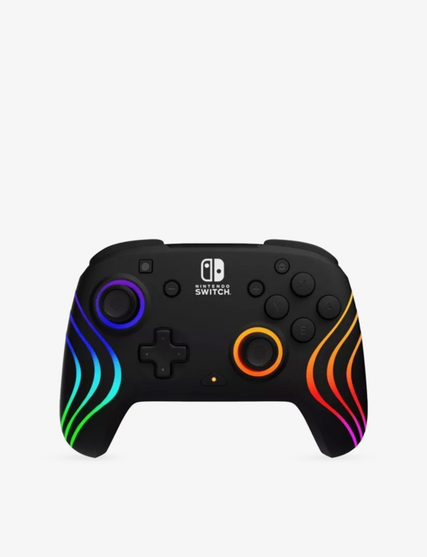 Make waves with the vibrant colors and combinations of the Afterglow Wave Wireless Controller's eight RBG lighting zones and four pre-set modes. With a built-in, 2100mAh rechargeable battery you won't need to purchase single-use batteries, so you can save the planet and your bank account. You'll need to call it quits before the controller with up to a 40-hour battery life. Get comfy on the couch for a long day of gaming with the 30-foot wireless range. Take down enemies quickly and efficiently by mapping controller functions to the two programmable back buttons. See your gaming in a new light with the officially licensed Afterglow Wave Wireless Controller for Nintendo Switch.