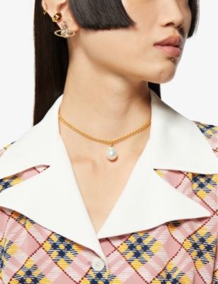 Three Row Bas Relief brass and Swarovski-pearl choker necklace- Price:$3,750.00
