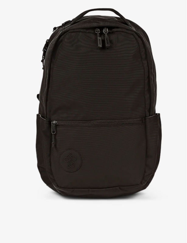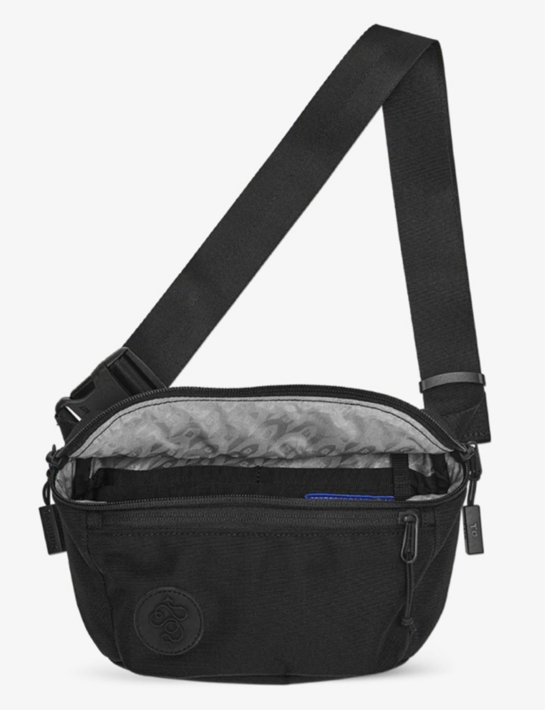 - Adjustable web shoulder strap, crescent shape, one front pocket, one mesh pocket, brand tab at front, two cord-fastened pockets at side, drop pockets at rear, mesh pocket at interior, zip pocket at interior, key clip at interior