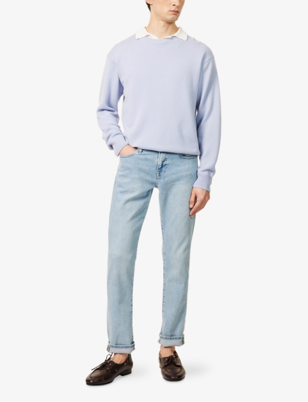 - Regular fit, mid-rise, straight leg, structured waistband, belt loops, classic five pocket design, faded wash, whiskering, branded hardware, contrast stitching, V-shaped yoke at back