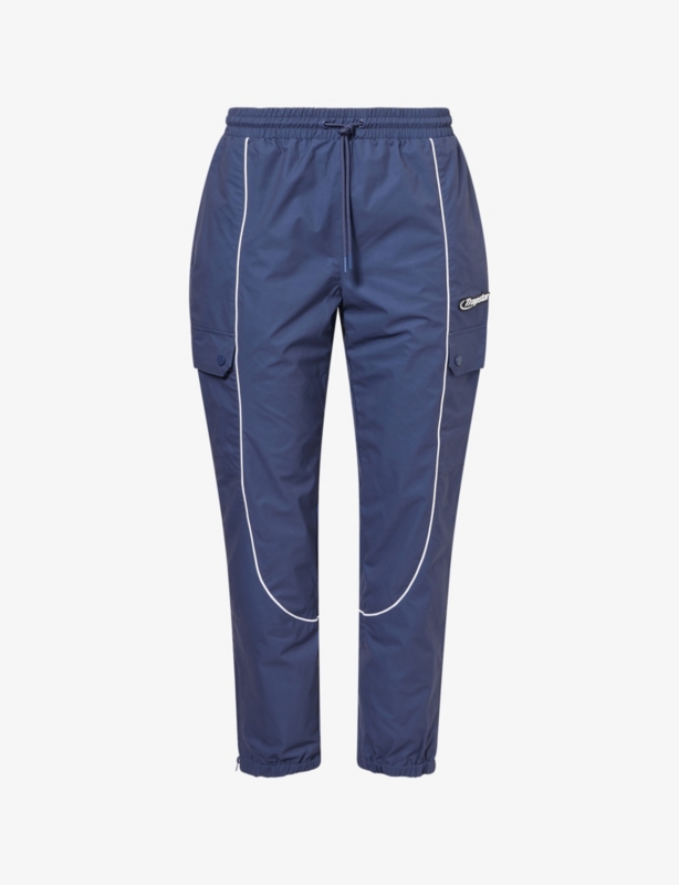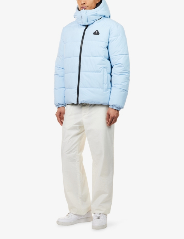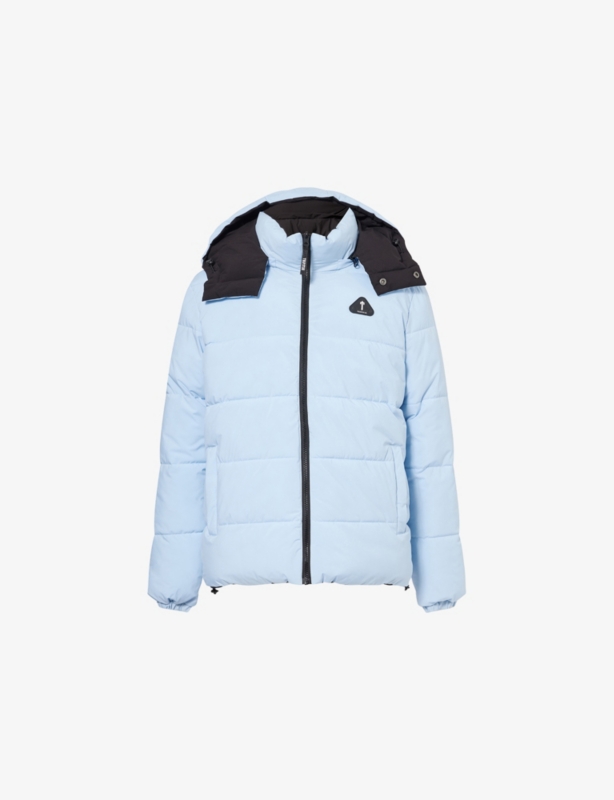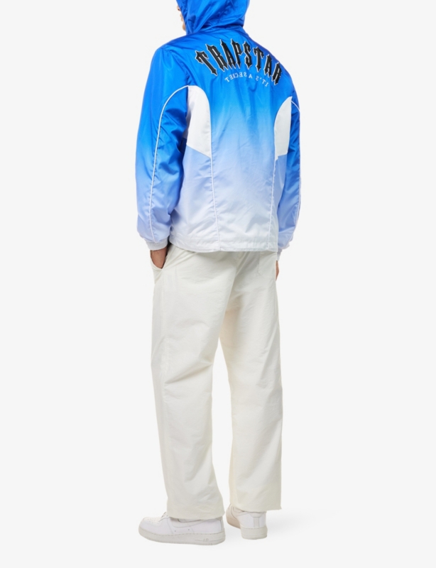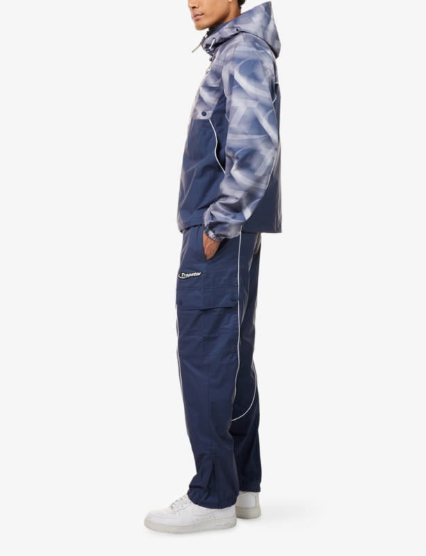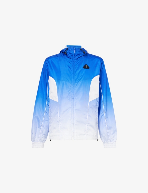 - Relaxed fit, high-neck, drawstring hood, raglan long sleeves, hook-and-loop tape cuffs, rubberised brand patch and two zip pockets at front, striped print at front and back, brand print at back, drawstring hem