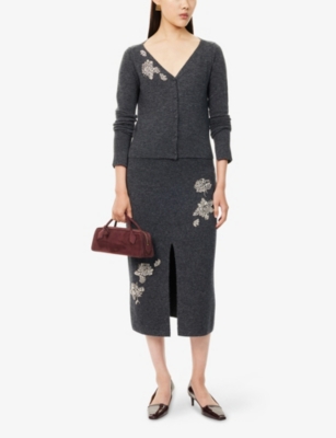 Embellished Technical-Blend Pencil Knitted Midi Skirt