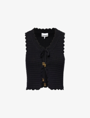 This collection brings together cotton tees, soft ribbed vests, and statement logo designs, crafted to pair seamlessly with tailored trousers, denim, or layered under blazers for a chic off-duty look. With flattering fits and elevated details, GANNI’s T-shirts and vests blend everyday ease with a modern edge, making them versatile staples that adapt to every season and style.