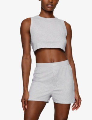 No Skims sleepwear collection is complete without silk PJs. The sensual allure of this lustrous fabric is enhanced by elegantly curved hems and notched lapels. For balmy evenings, combine a relaxed-fit cami with adjustable shoulder straps and matching shorts topped with an elasticated waistband. Talk about a dreamy combination.