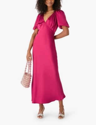 Draped Pleat V-Neck Satin Midi Dress