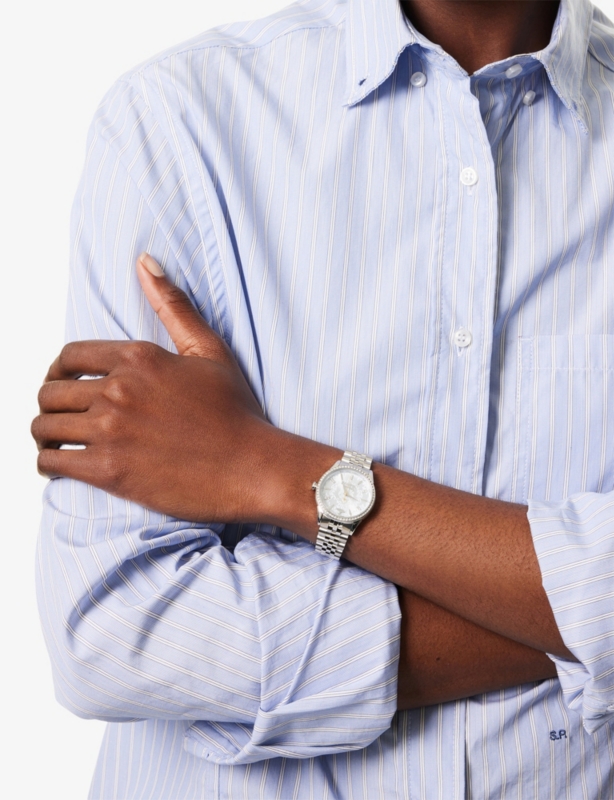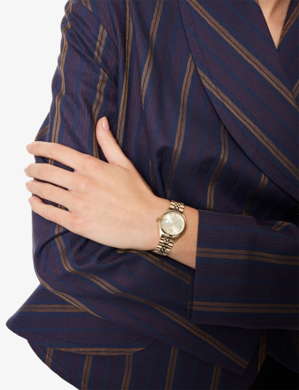 - Round case, engraved bezel, branded orb 12'o'clock marker, silver-tone index markers, three-hand quartz movement, bracelet strap