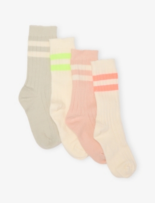 Keep little feet warm with a pair of girls' slipper socks. Expect soft and stretchy wool constructions, finished with anti-slip soles. For next-level cosiness, explore our range of slippers. Think fluffy faux shearling and buttery suede, with pairs finished with soft fabric or hard-wearing EVA outsoles. You'll find an array of breathable cotton girls' socks across the selection, crafted with a hint of stretch for maximum durability and comfort. Vibrant patterns appear throughout, including bold graphics. If you're looking to keep things simple, opt for a pair of girls' designer socks in a soft pastel hue, from baby pink to sky blue.Â