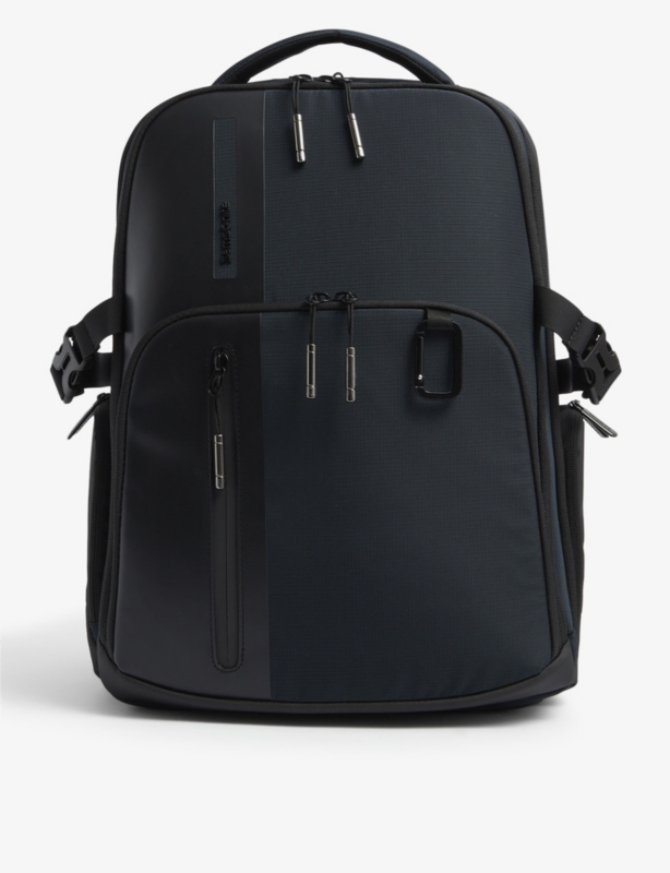 - Structured shape, top handle, three zip pockets at front, one main compartment, ergonomic shoulder strap