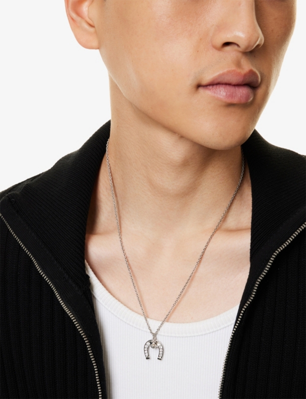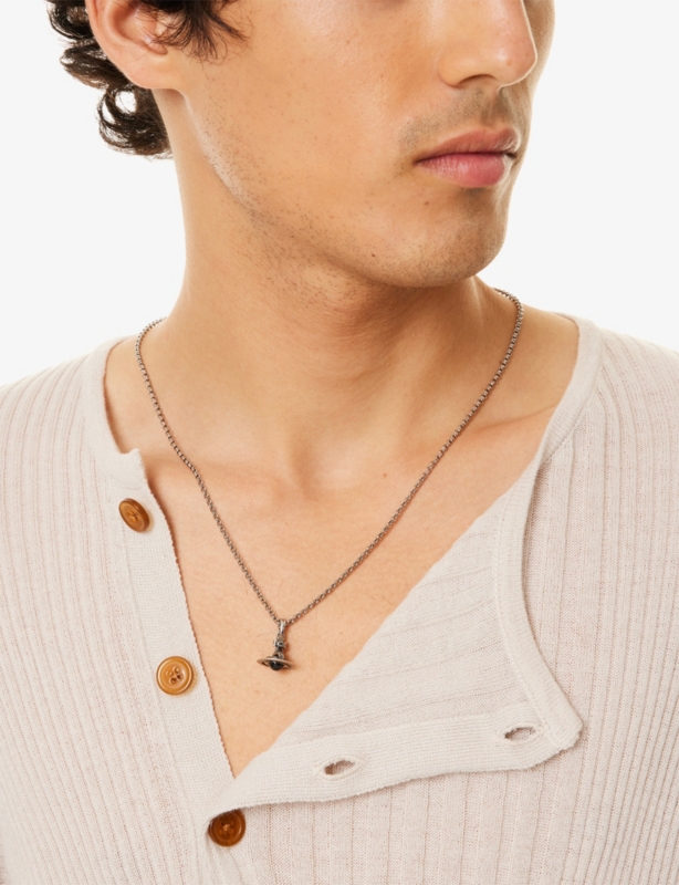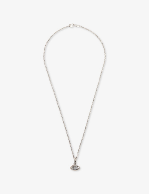 - Signature orb pendant, polished finish, brand-engraved tag at fastening