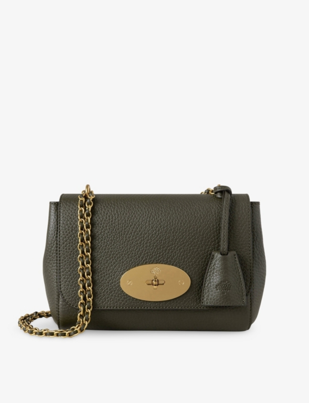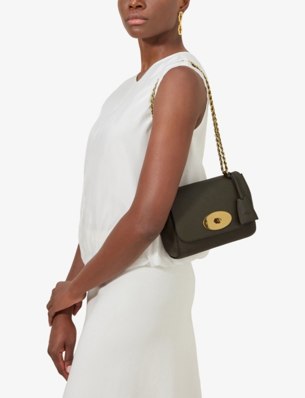 - Twin top carry handles, adjustable and detachable leather shoulder strap, hidden padlock in hanging leather pouch, one main compartment, one internal hanging zip pocket, internal Mulberry fob, gold hardware
