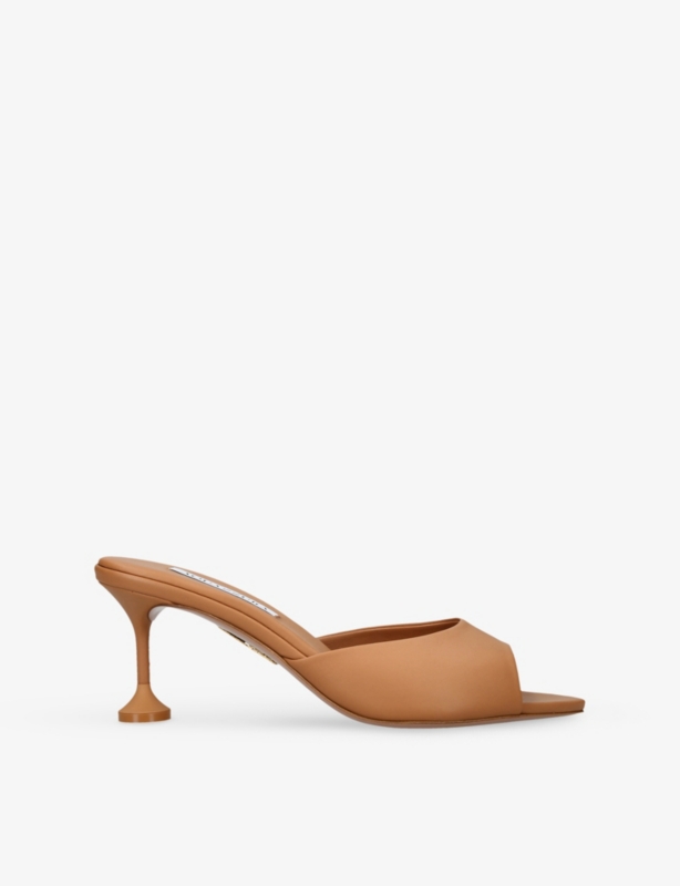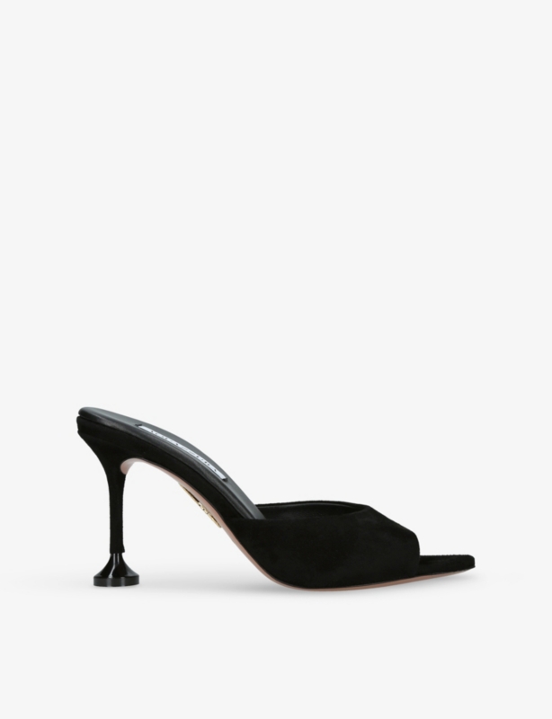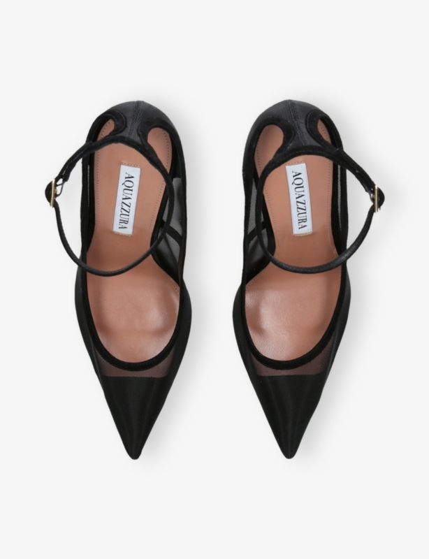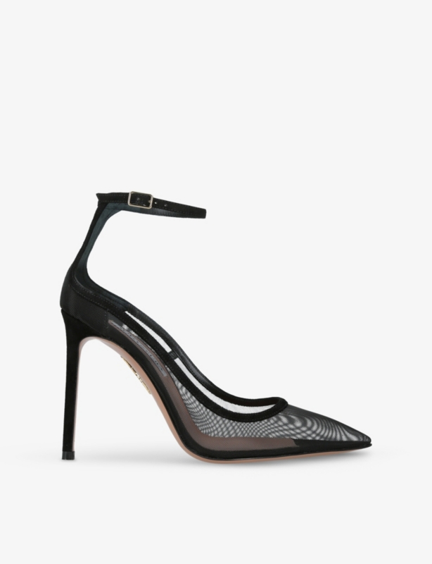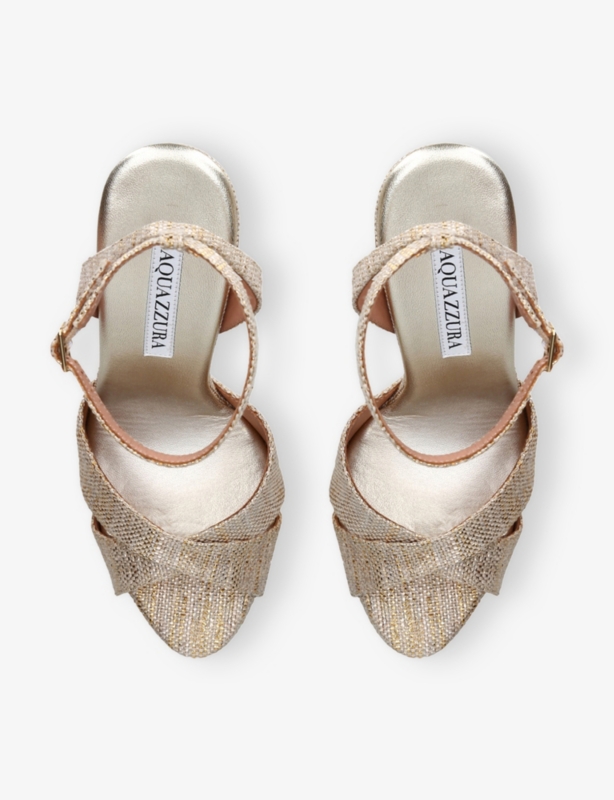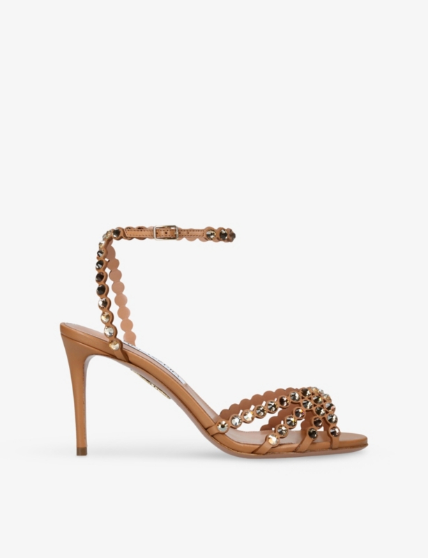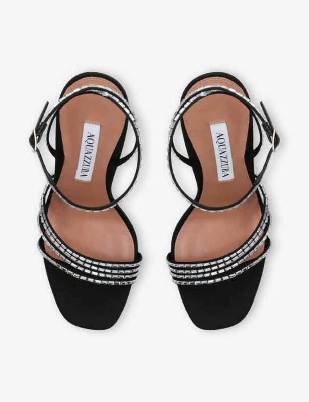 - Round open toe, metallic finish, stiletto heel, all-over crystal embellishment, ankle strap, Pineapple logo-embossed sole