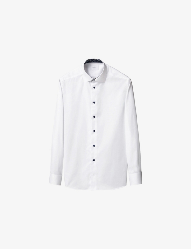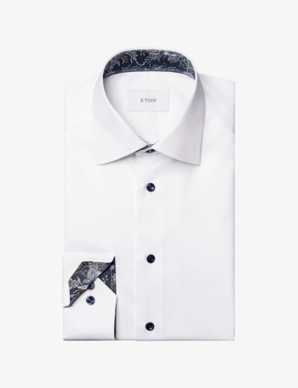 - Contemporary fit, cut-away collar, long sleeves, buttoned cuffs, floral-print trim