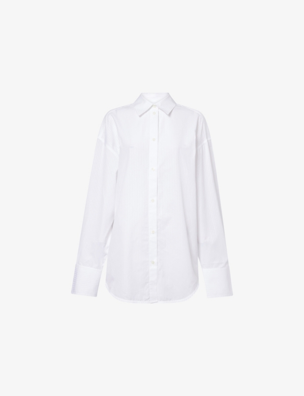 - Oversized fit, long sleeves, branded pearlescent buttons, all-over brand embroidery