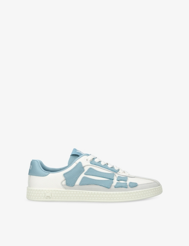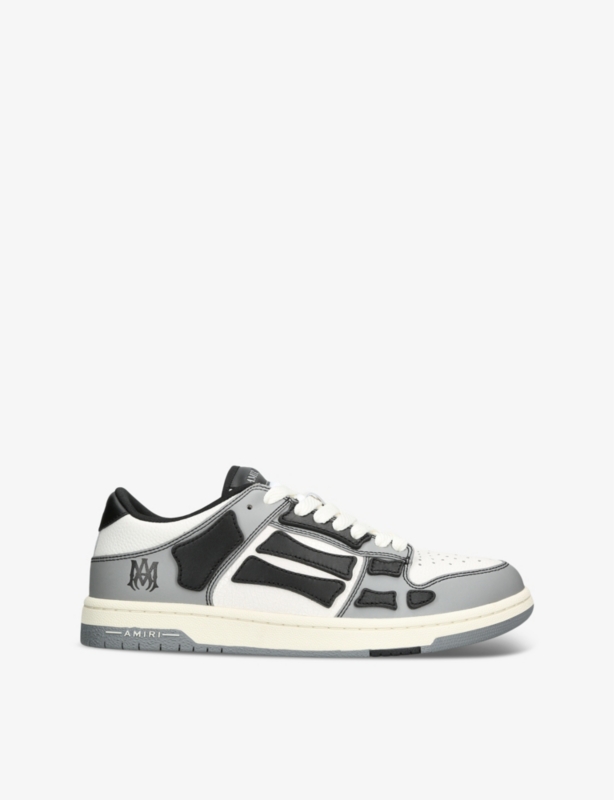 - Round toe, contrast panels, leather bones appliqué, branded sole
