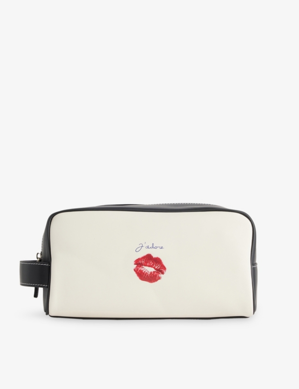 - Cherry print, brand foiled text, six card slot, central cash pocket, contrast stitching