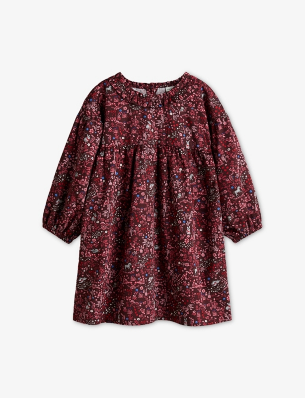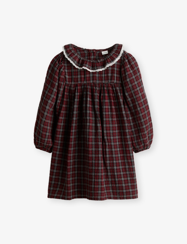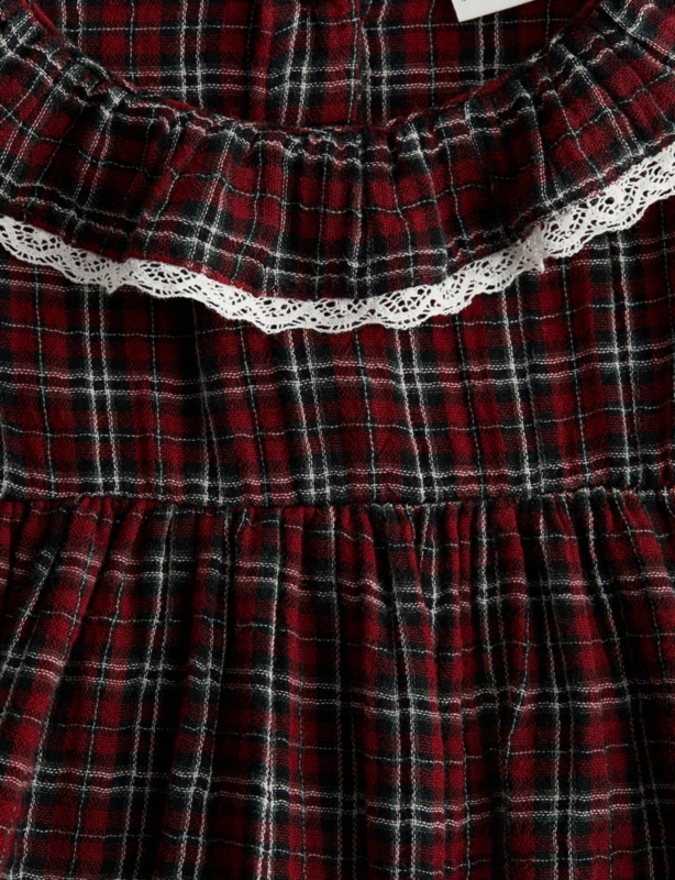- Regular fit, round neck, short sleeves with frilled trims, gathered seam above waist, flared skirt