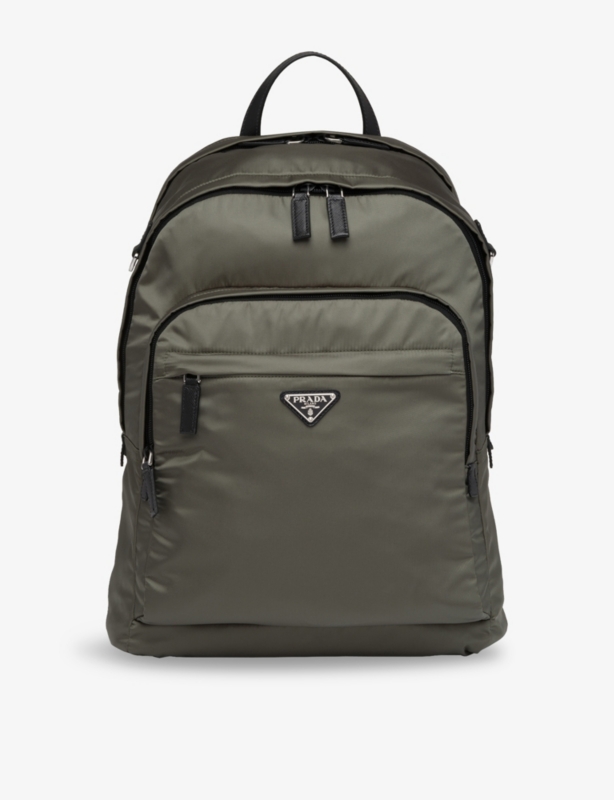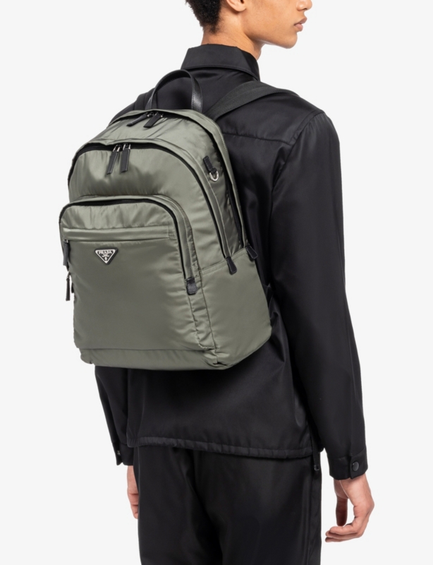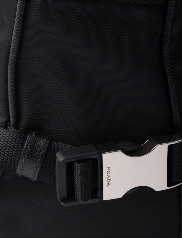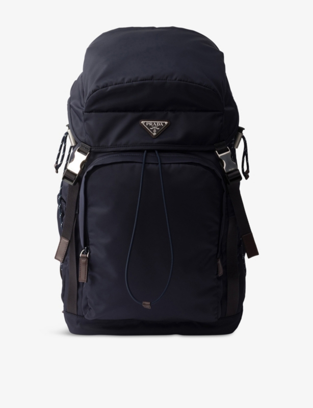 - Square shape, adjustable woven-tape shoulder strap, enamelled metal triangle logo at front, front flap, side-release buckles, one main compartment, one interior zip pocket, one exterior zip pocket, lined