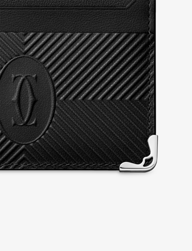 - Must de Cartier collection, four-credit card holder, perforated calfskin, double C logo, palladium-finish metal corners, silver-tone Cartier signature, four credit card pockets, three flat pockets