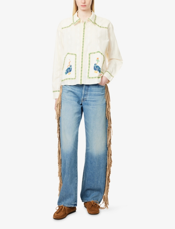 - Exoised button and concealed zip-fly fastening at front